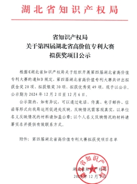 第四届湖北省高价值专利大赛自2024年7月开赛以来,得到了社会各界的广泛关注。全省共有317个项目报名参赛,参赛项目涉及光电子信息、高技术服务、先进制造、生物医药与健康、新材料与新能源等6个技术领域,赛事评选共分为“形式审查、初赛、复赛、决赛”四个阶段,重点围绕专利的“创新性、实用性、技术先进性、运用及保护成效、社会效益及发展前景”等方面进行评选,经过层层严格选,本届大赛将评选出20个金奖(公司2项)、30个银奖、49个优秀奖。其中,公司乔瑜教授作为第一发明人的专利“一种有机废弃液自维持阴燃连续反应装置及反应方法”获得金奖,全省排名第三。
