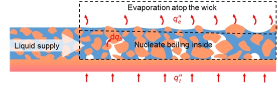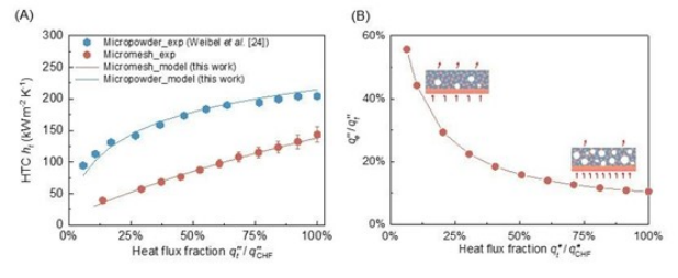 团队提出了一个高精度和通用的薄液膜沸腾传热模型,可对烧结铜网、烧结粉末、微柱阵列等多种微结构表面的薄液膜沸腾换热特性(包括传热系数和临界热流密度)进行准确预测。该模型包括液膜内部沸腾、液膜顶部蒸发的自适应框架,可得到不同热流密度下,液膜内部沸腾和顶部蒸发的换热比例与汽液两相含率,从而实现内部热质传递的准确计算。同时,传热模型可以用于预测毛细结构表面上薄液膜沸腾的完整沸腾传热曲线。在对应的假设条件下,所开发的模型可以简化为文献中已有的沸腾与蒸发换热模型,说明其是一个具有强大功能的、基于机理的、更为统一的传热模型,并有望为设计薄液膜沸腾表面提供指导。相关研究以“A heat transfer model for liquid film boiling on micro-structured surfaces”发表于《国家科学评论》(National Science Review, NSR).