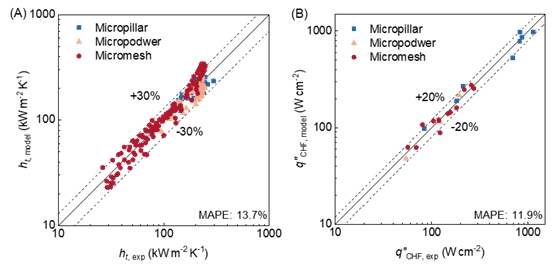 Pic 多种结构表面上的液膜沸腾换热性能预测:(A)传热系数和(B)临界热流密度