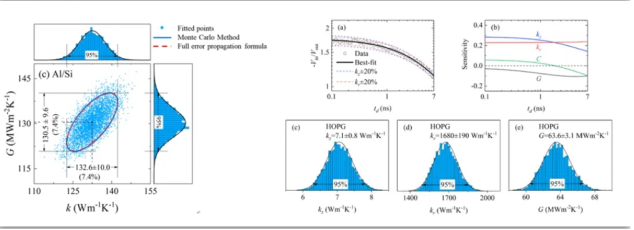 高通量测量和数据处理是开发新型功能材料的重要环节。团队利用机器学习模型实现了大量实验大数据的高通量处理。通过训练神经网络,使得机器能够“识别”信号并快速“说出”信号所对应的热物性参数,从而极大地缩减了信号处理的时间。比如,机器学习模型可用于快速蒙特卡洛误差分析,将原本需要超过24小时的迭代处理缩减为12秒即可准确完成。机器学习模型的另一大优势在于能够识别实验信号的细微特征,从而能够同时准确提取多个参数。例如,对于HOPG样品的TDTR测量信号,采用机器学习模型来处理即可同时确定其面内、纵向热导率和界面热导,并快速给出误差分析。此项工作发表于Journal of Applied Physics,并被选为Editor's Pick。