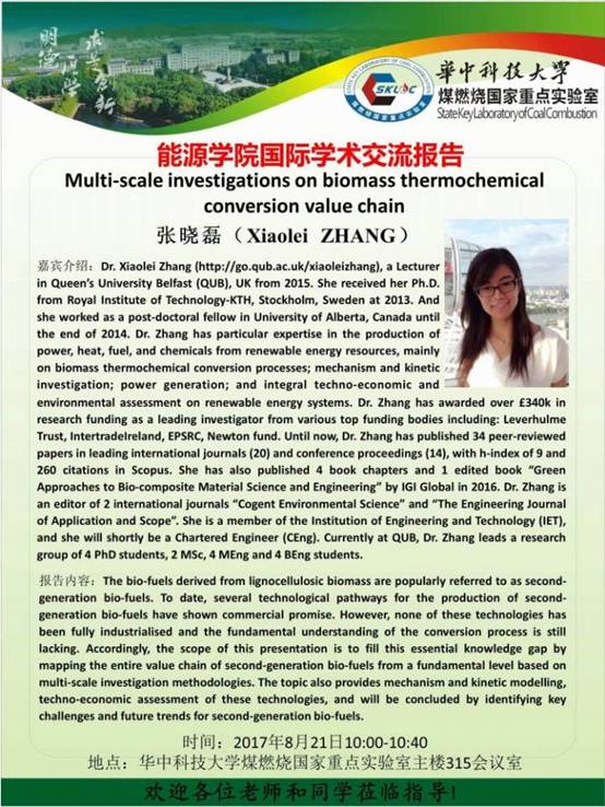 本站讯(通讯员王泽安)2017年8月21日,应煤燃烧国家重点实验室刘豪老师邀请,来自英国思克莱德大学(University of Strathclyde)化学化工公司(Department of Chemical and Process Engineering)讲师、李君博士(Dr.Jun LI)以及英国贝尔法斯特女王大学(Queen's University Belfast)机械与航空航天公司(School of Mechanical and Aerospace Engineering)讲师、张晓磊博士(Dr.Xiaolei Zhang)来实验室进行了交流访问,并分别做了学术报告。实验室杨海平教授、邹春教授、于敦喜教授、张成副教授、于洁老师、陈应泉老师等师生参加了本次学术交流。