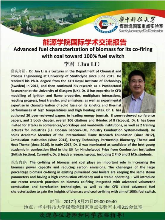 李君博士做了题为“Advanced fuel characterization of biomass for its co-firing with coal toward 100% fuel switch”的报告。报告中详细介绍了英国生物质与煤混烧的发展现状及其研究团队在生物质烘焙、着火机理以及混烧CFD模拟方面取得的研究成果。同时,李君老师还向实验室师生介绍了现有的中英国际合作项目申请、博士生联合培养以及学术交流的平台。