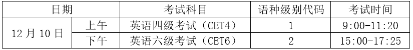 CET准考证打印:12月1日9:00起,考生可自行登录全国大学英语四、六级考试网站(网址:http://cet-bm.neea.edu.cn)首页,通过“快速打印准考证”,完成笔试科目准考证的打印。