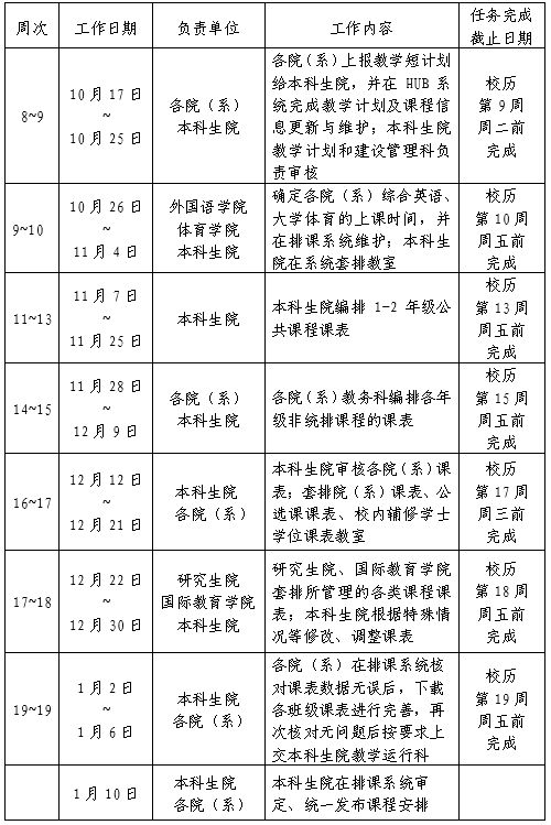 2022~2023学年度第二学期普通本科生课程表的编制工作定于2022年10月17日至2023年1月6日进行(校历第8周~第19周)。在编制本科课程表的过程中,请各院(系)及有关教学单位严格遵照以下各项规定: