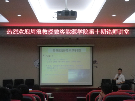 讲座伊始周教授就太阳能电力与世界可持续发展谈起,列举近20年来的统计数据对“太阳能电力只是欧洲富人的奢侈游戏”这一说法进行批驳。进而展开介绍世界太阳能电力发展简史,太阳能电力的发展可谓一波三折。对于未来光电前景,周教授认为,现阶段国内市场虽然暂时陷入低潮,但是在当代能源危机和人们对清洁能源的需求加大背景推动下,光伏产业无疑将迎来光明的未来。紧接着,周教授由光伏技术、光伏产业市场、太阳能光伏与太阳能热电应用及数个基本是非问题四个方面进行简要介绍。