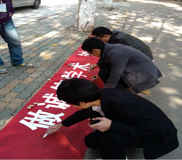 11月12日,在西校区西十四员工宿舍楼下,举行了以“做诚信学术,树诚信学风,创诚信校园”为主题的学术诚信签名活动,活动前期进行了校内海报宣传以及网络宣传,以提高大家对此次活动的积极性。活动过程中发放了宣传单,并进行了学术诚信签名。活动得到大家的广泛关注和支持,同学们踊跃参与,并在宣传横幅上签名,纷纷表达了对此次学术诚信活动的认同,表示将在今后会自愿以诚信科研要求自己,自觉加入到学风道德建设的潮流中来。