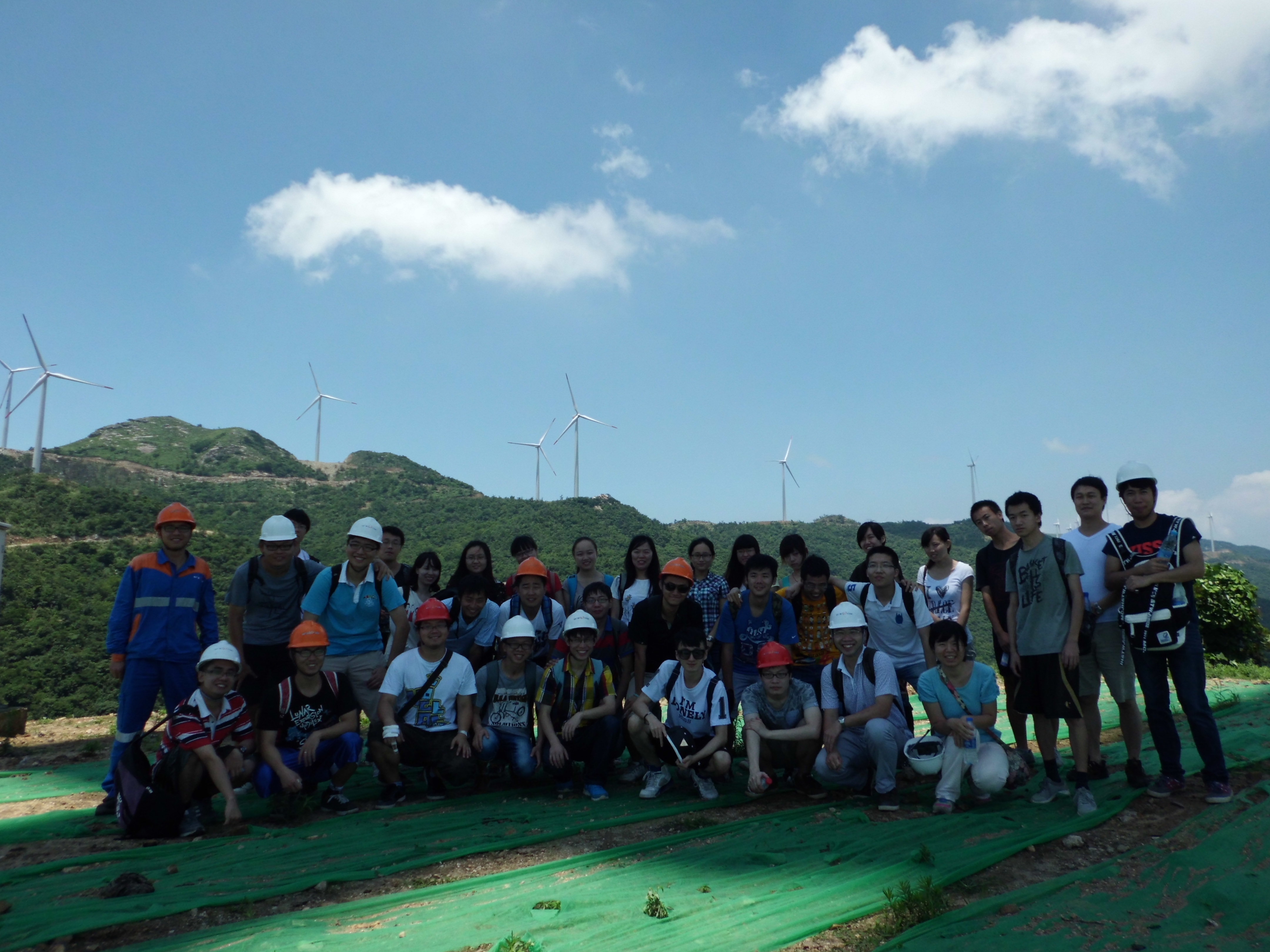 实习队首先来到五岳山风电场。五岳山风电场位于湖北省孝感市大悟县五岳山,建于2011年,分三期建设,现已完成二期工程,共建成55台风机。实习队由五岳山风电场的陈工程师引导参观风电场,由于风机都安装在各座山上,队员们只能徒步前行,来回共走了近36公里的山路,虽然走路比较辛苦且顶着太阳的暴晒,但丝毫没有减弱同学们学习的热情,大家都积极围着工作人员咨询问题,学到不少实践知识,对实际风电场的运行现状有了更深入的了解。