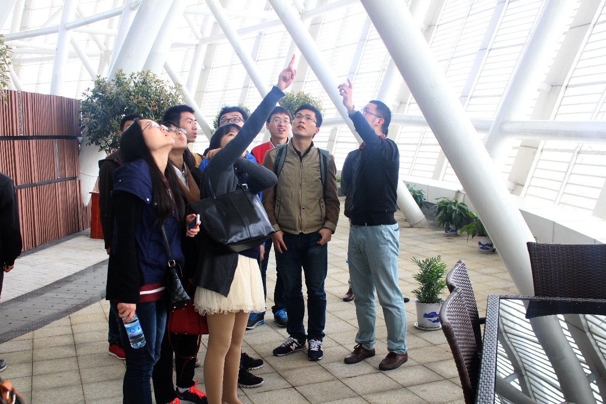 最后,同学们一起参观了该建筑的顶楼花园,头顶的太阳能电池板和风能利用塔以及雨水回收装置等淋漓尽致的展现了研究院大楼的节能环保,预示着未来能源之花将在此绽放。