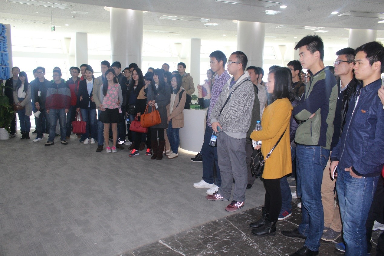 在讲解员的带领下,同学们乘坐电梯到达“马蹄莲”主体建筑的第16楼参观建筑群的沙盘模型,并且在工作人员的安排下,观看了两段新能源研究院的宣传短片,让同学们了解了“马蹄莲”仿生建筑的设计理念,其14%的绿色建筑节能效应远远高于国家标准的2%,这给同学们留下了深刻印象。随后在讲解员的引领下,同学们分批参观了研究院展厅,展厅陈列着研究院的运作机制、组织架构及各个研究中心的众多科研成果,在讲解员的精彩讲解下,同学们对研究院有了更加深入的了解。