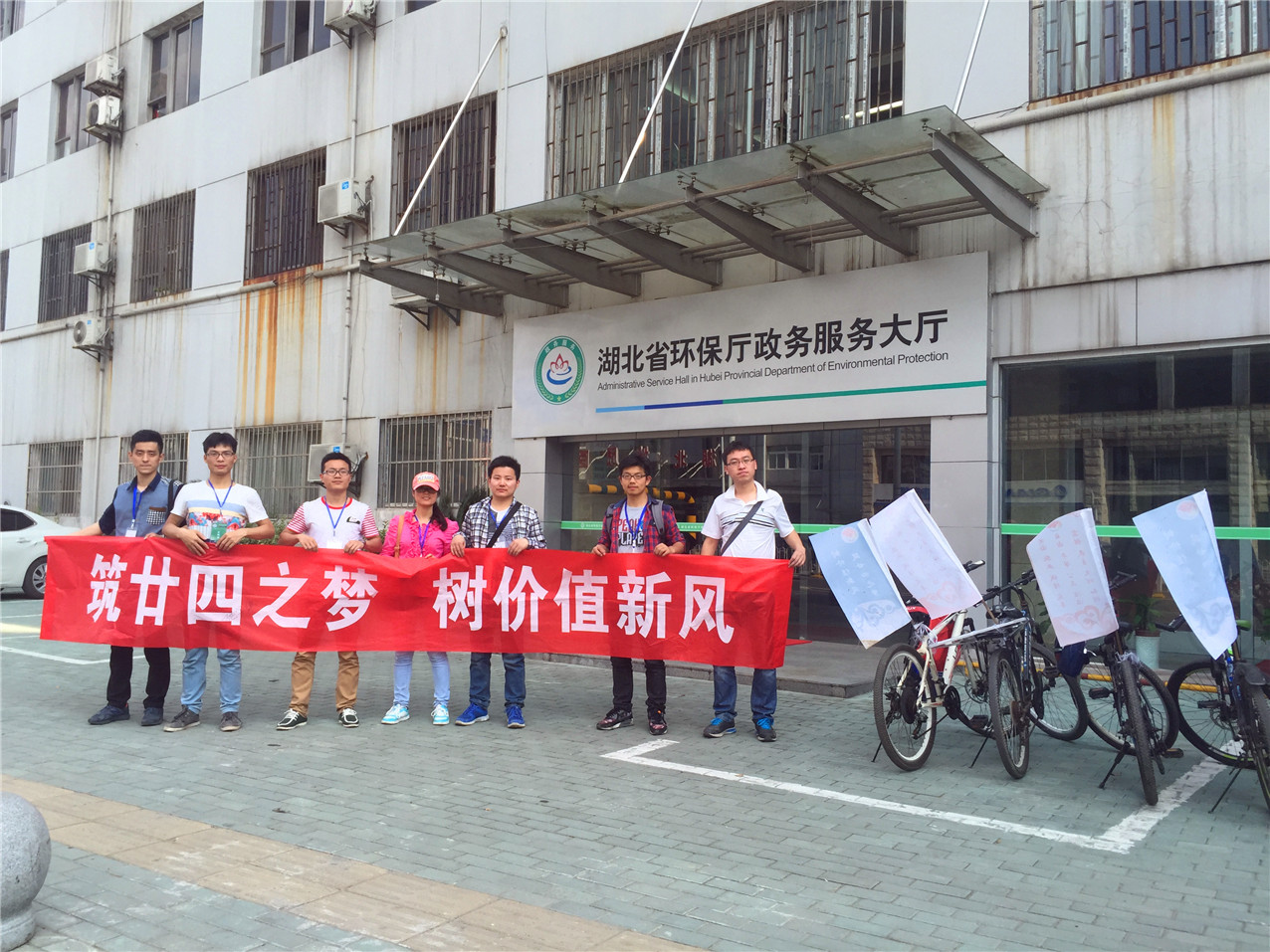 骑行队伍最后到达湖北省环保厅。在政务服务大厅,队员们仔细阅读了有关环保方面的最新法律规章条例,了解到近几年来湖北省在生态文明建设方面所做的努力以及今后的规划,收获颇丰。