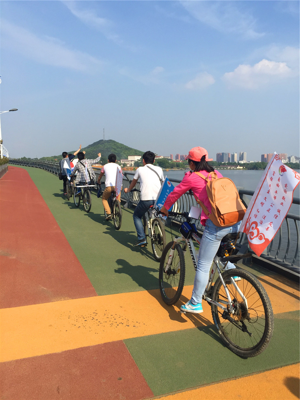 此次骑行从伟德BV1946官网煤燃烧国家重点实验室出发,途径武汉植物园、东湖生态风景区、湖北省博物馆、武汉大学、湖北省环保厅等地,全程约60km。一路骑过,自行车座上的彩旗随风起舞,诉说着活动主题及社会主义核心价值观,辅之以队员们响亮的口号,成为了一道亮丽的风景线。