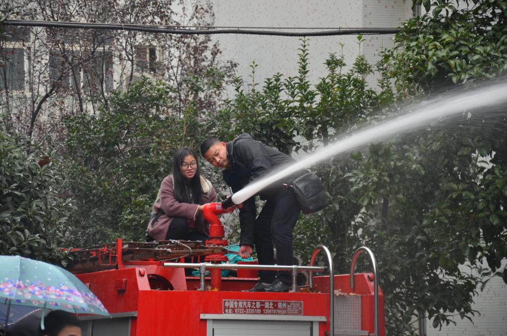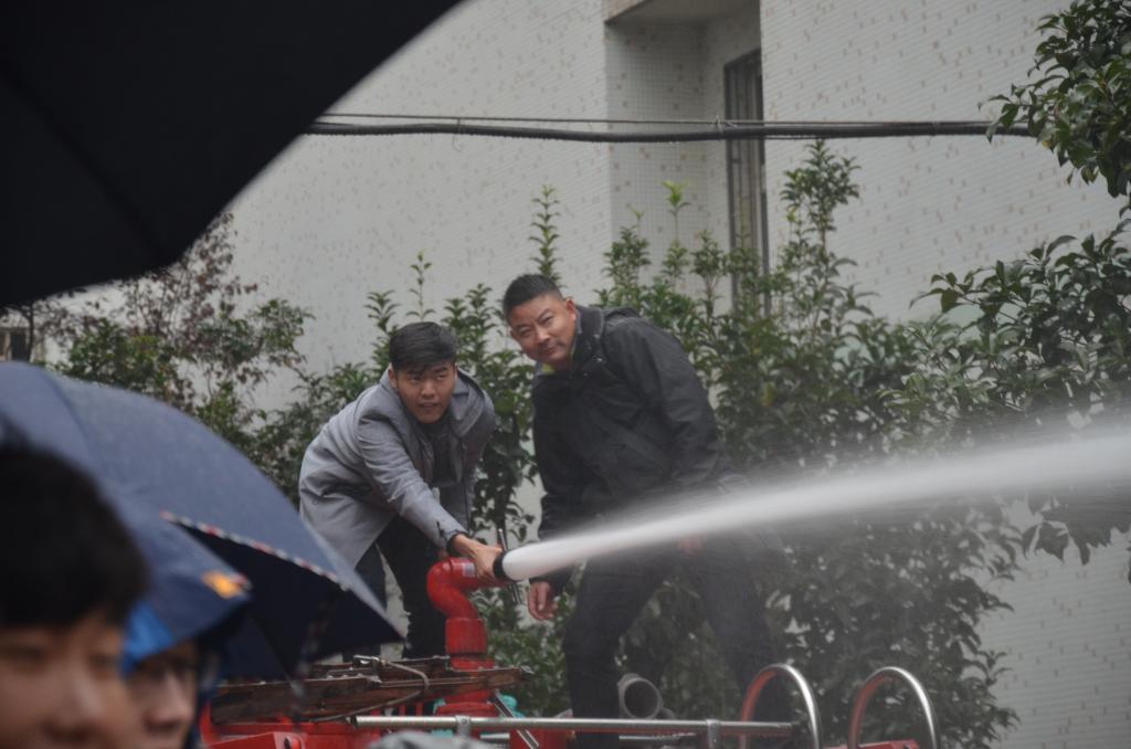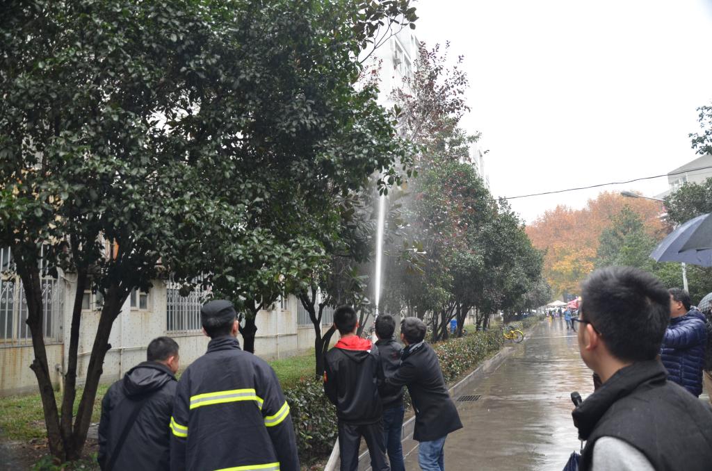 最后,在保卫处老师的指导下,冯晓东老师和两名员工操控消防车上的消防水炮对被点燃火源进行喷射灭火,通过这个项目大家对消防水炮的使用又有了进一步的了解。