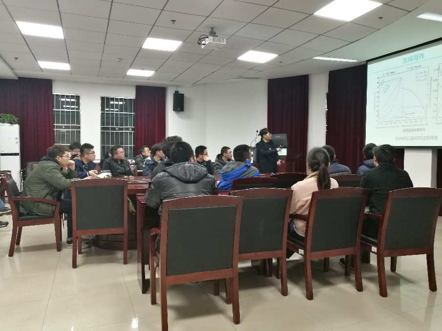 在这次学术讲座中,隆瑞老师首先介绍了自己的研究方向以及读博士时的感受;然后,以具体的文章写作示例讲述了论文写作的一般步骤,比如:这项工作的意义、构建模型、进行性能评价、分析影响参数、观察变化的趋势以及寻找规律、解释规律背后的物理机理、再次回归系统本身进行参数优化等。隆老师的语言比较诙谐、幽默,大家听得非常投入、认真,现场气氛非常好。