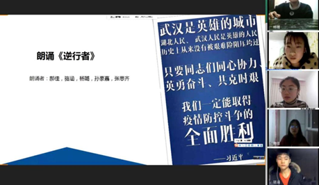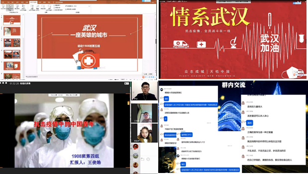在专题分享环节,郑妮婷带领大家进行集体学习。学习习近平总书记对疫情防控工作的系列重要讲话和指示批示精神;学习了教育部的致信精神;学习华中大人的医学精神。班级同学则自选主题,分小组在进行自主学习和讨论的基础上,并由小组代表做主题分享。艾拉提以《抗疫在行动》为主题,展现抗疫过程的中国基建力量、科研力量和制度力量;关曼华讲述自己父亲的故事,表达了全国人民奋战在抗疫前线的坚定决心;钱俊飞则以中外对比的方式展现了中国抗疫的世界意义;王俊皓通过分享抗击疫情中的多个青年故事,让大家体会中国青年精神与力量。张惟茜聚焦武汉-一座英雄的城市,必将取得此次疫情防控的全面胜利。