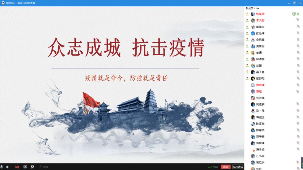 身在五湖四海,心却紧紧相依。课程变难,部分同学难以适应,班委主动联系老师组织集中答疑,不让一位同学掉队。武汉封城,有同学身处武汉,大家时刻关注、嘘寒问暖,没有被禁锢的城,只有隔不开的爱。疫情持续,同学心态发生波动,班会团会上大家敞开心扉,每句温暖的话语代表了每一位同学关怀的心,大家在一起防控疫情,用“心”战役、共克时艰。班长张泓玮同学谈到:“我们是一家人,我们每一个人都会互帮互助、携手前行,加油!”
