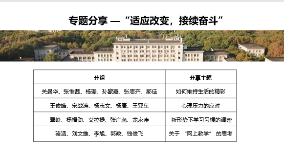 主题汇报环节,同学们先轮流分享了自己的近况,随后以翻转团课的形式,围绕“适应改变,持续奋斗” 进行分组汇报。关曼华代表小组从培养爱好、丰富自我和养成习惯三方面鼓励大家在家期间关注生活、热爱生活,维持生活的精彩。杨康代表小组分享了心理压力的应对策略,考虑到同学们本学期在家的实际情况,重点对家庭关系、人际关系和情绪管理提出应对建议。覃岭聚焦学习情况,谈到新形势下学习习惯的适应,分享了提高学习效率的建议和辅助工具。刘文雄代表小组从员工的角度对本学期网络教学工作提出了思考与建议。