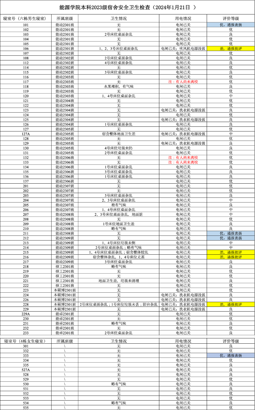 2024年1月21日,公司学工组和研究生班主任对全体23级员工宿舍进行安全卫生检查,重点检查宿舍卫生情况、安全用电情况,实现了100%的清查覆盖率。检查结果整体较好,仍有少数宿舍存在卫生和安全隐患,具体情况如下:
