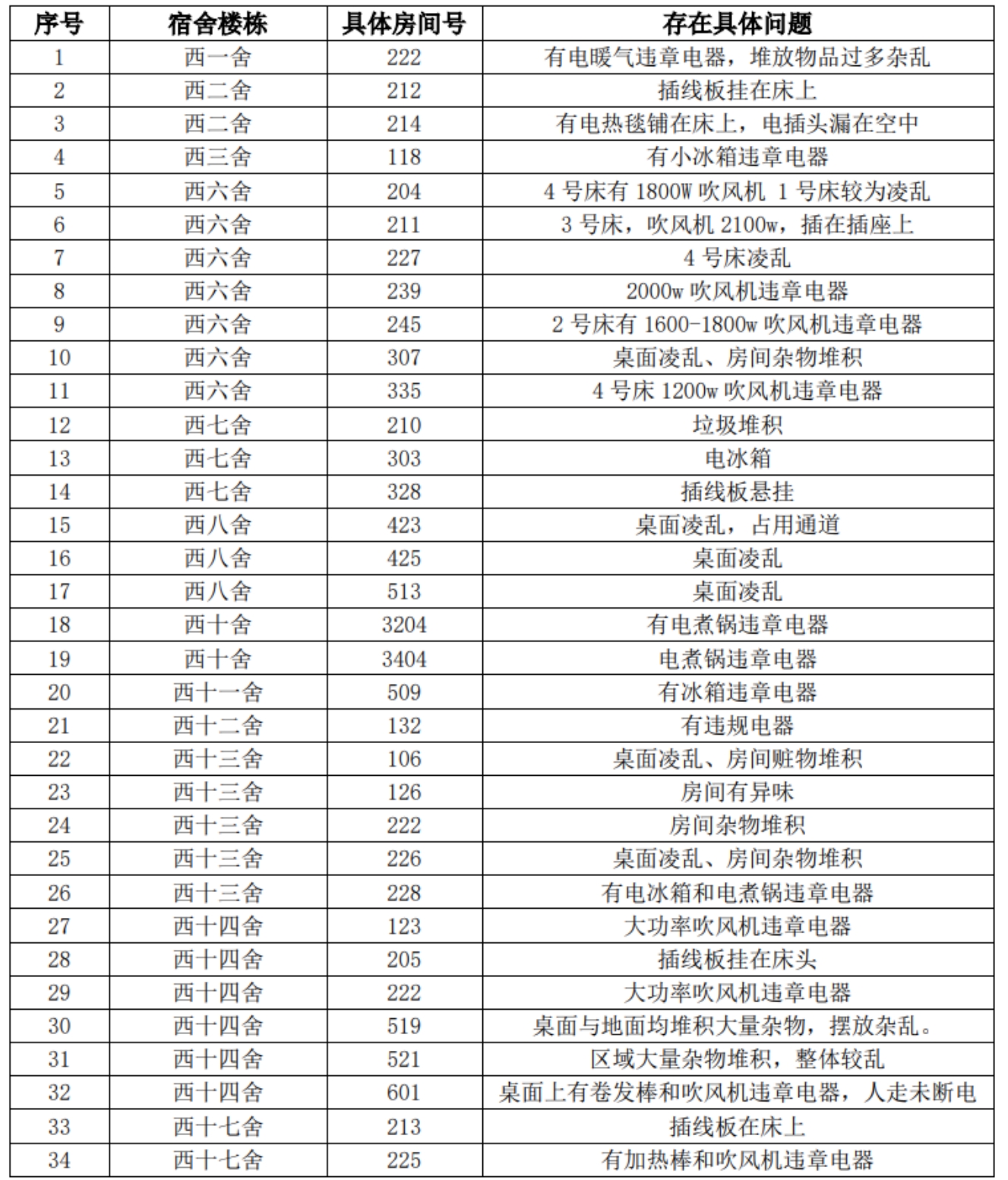 特此对检查结果进行通报,目前宿舍安全情况、卫生情况不达标的宿舍在1月23日之前整改完毕,请各党支部、班级在规定时间内落实自查情况。