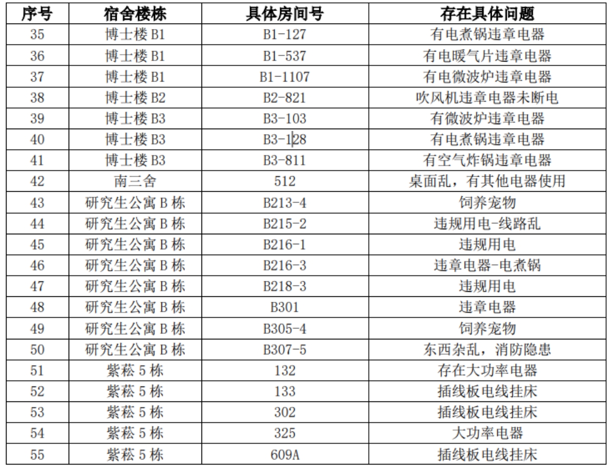 1月18日,公司研工组、研究生德育助理、党员卫生安全岗对全体硕博研究生宿舍进行了安全和卫生检查。为确保本次专项检查能够做到“360°无死角”和100%的清查覆盖率,此次检查覆盖了西一舍、西二舍、西三舍、西四舍、西五舍、西六舍、西七舍、西八舍、西九舍、西十舍、西十一舍、西十二舍、西十三舍、西十四舍、西十五舍、西十六舍、西十七舍、教八舍、东八舍、南一舍、南三舍、紫菘一栋、紫菘五栋、紫菘七栋、博士生楼B1-B4以及研究生公寓A栋、B栋等楼栋。本次专项活动将对所有研究生宿舍检查中比较突出的问题进行整理,对宿舍卫生和违章用电、违规电器使用等可能存在的安全隐患进行了仔细排查,出现的典型问题主要有:床铺及桌面物品摆放杂乱、衣物和垃圾堆积、通风不畅有异味、违章电器使用(电水壶、电锅等)、违规用电(在床上接插排、人走不断电等),并责令整改。