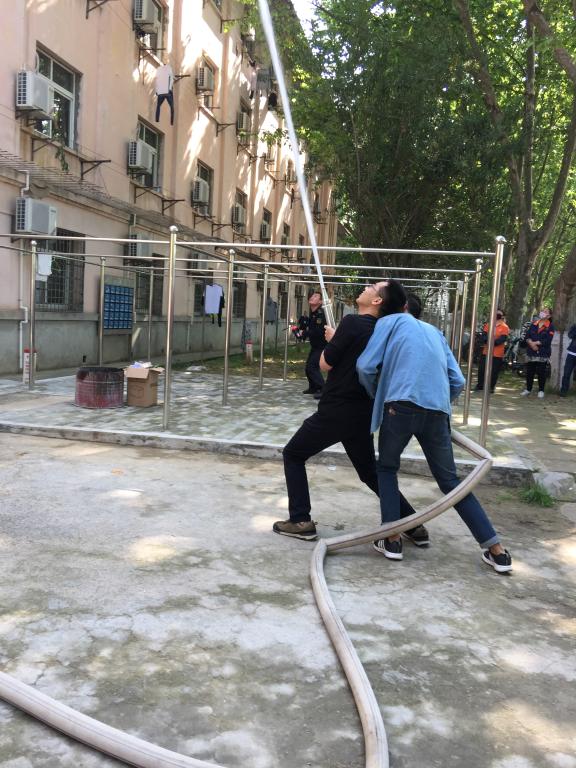 “火灾”发生,警报拉响后消防车辆迅速赶往“火灾”现场。扑救组的同学利用宿舍室内消火栓进行灭火,消防车从地面打出高压水柱扑灭了西六舍的“火灾”,另有消防官兵现场演示了手持高压水枪进行灭火。