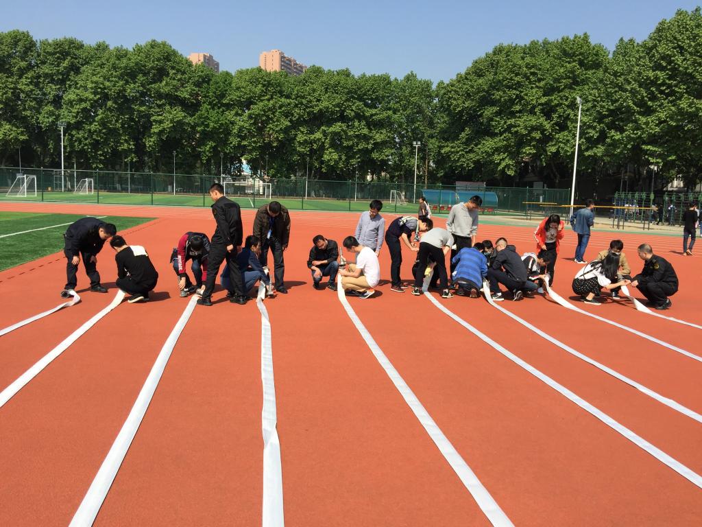 逃生演习之后,在秩序维护组的带领下,全体人员到达消防水带操作训练地进行学习演练。在西操跑道上,同学们按班级指定位置站于演练区域两侧。