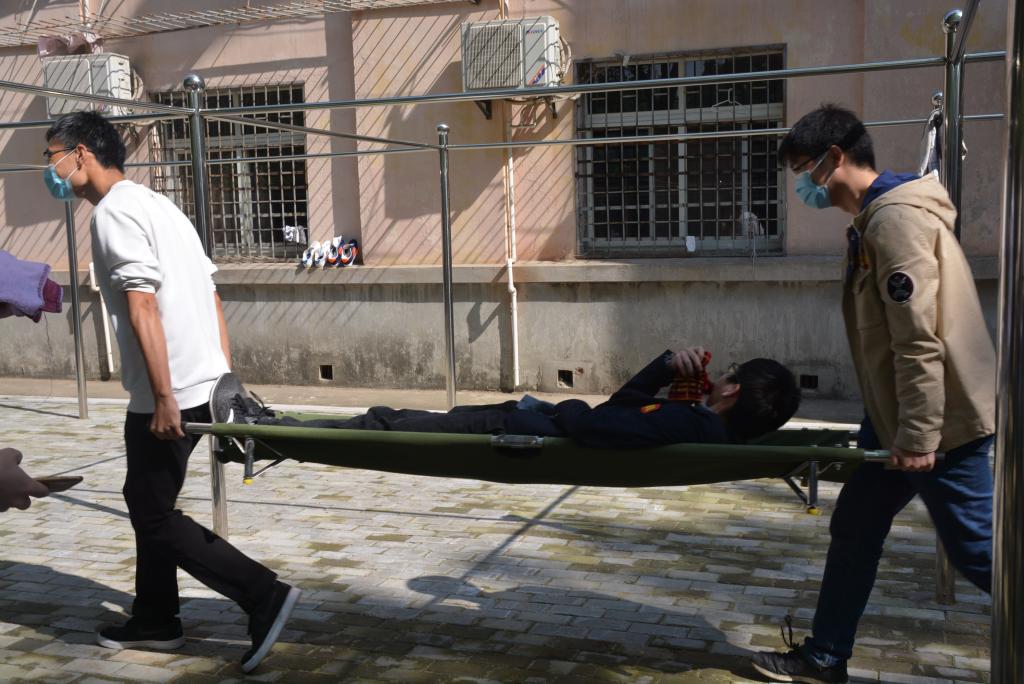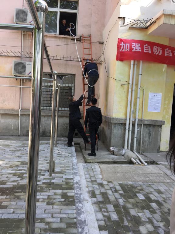 同时西六舍一楼某房间的“受伤”员工,被同学用担架抬出,并送达指定地点进行救护。在西六舍二楼模拟火灾现场火势凶猛、浓烟滚滚被困室内无法逃生的情况,一员工从窗口爬消防梯紧急逃生。