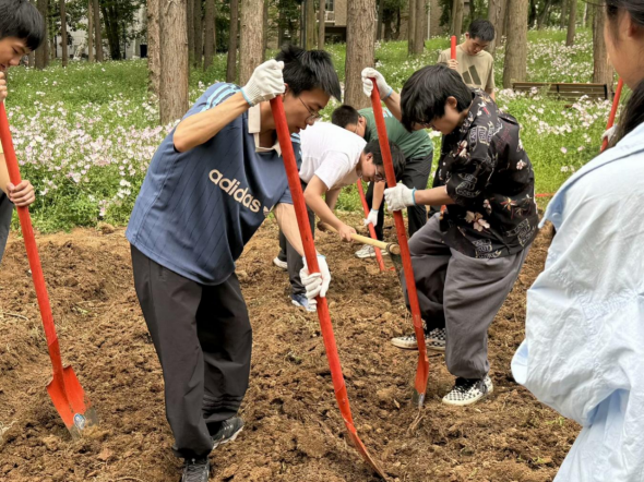 在翻耕起垄完成后,同学们将洛神花幼苗从育苗盘中取出,轻轻放入土中,再用细土覆盖根部,确保每一株幼苗都能稳固地扎根于土地。每一株被移栽的幼苗,都承载着大家对绿色未来的美好期许,在阳光雨露的滋润下,它们将茁壮成长,为校园增添一抹抹动人的绿意。