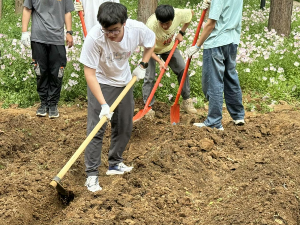 在辅导员汪安稳的亲自指导下,同学们迅速行动起来,拿起铁锹、锄头开始翻耕土地。大家分工明确,配合默契,有的负责铲起泥土,有的负责将土块打碎,还有的负责平整土地。经过一番辛勤努力,原本板结的土地变得松软而富有活力,一道道整齐的田垄逐渐成型,为种子的生长创造了良好的条件。