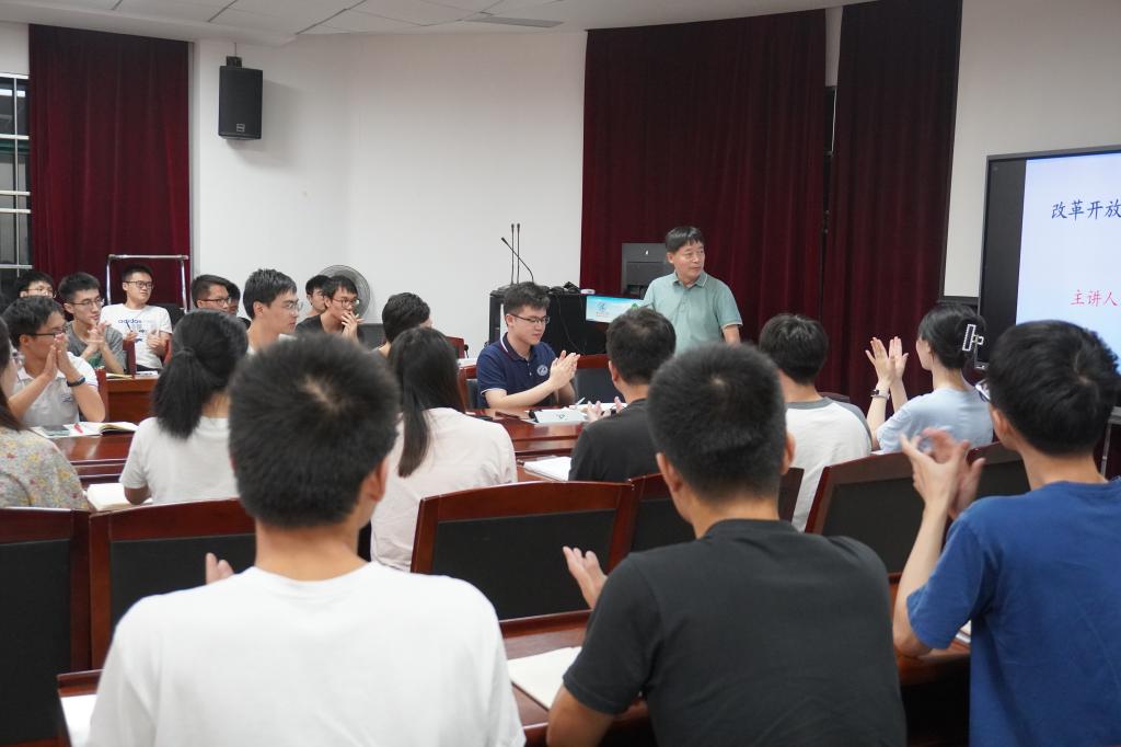 主题党日的第二个部分是尹平老师带来的一堂生动党课。尹平老师以改革开放的历史性选择为题开讲。尹老师讲到,改革开放是我们党的一次伟大觉醒,是中国人民和中华民族发展中的一次伟大革命,民生艰难和民众觉醒是倒逼改革开放政策出台的重要原因,世界经济的快速发展和科学技术的日新月异也同样是促成改革开放的历史性因素。