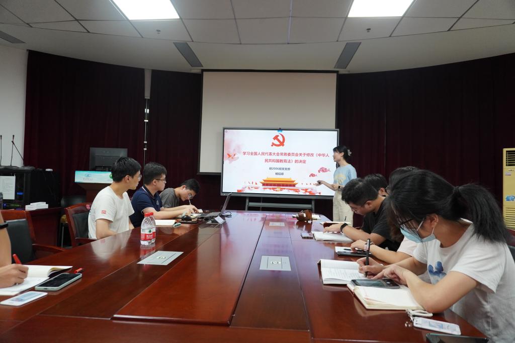 随后,硕2006班党支部杨钰婷同志介绍了《中华人民共和国教育法》的修订内容及意义,回顾了我国教育事业蓬勃发展的历程,探讨了教育公平来之不易。本科2020级能卓2001班入党积极分子王涵同志结合《中共中央关于加强对“一把手”和领导班子监督的意见》分享了党风廉政建设相关内容。