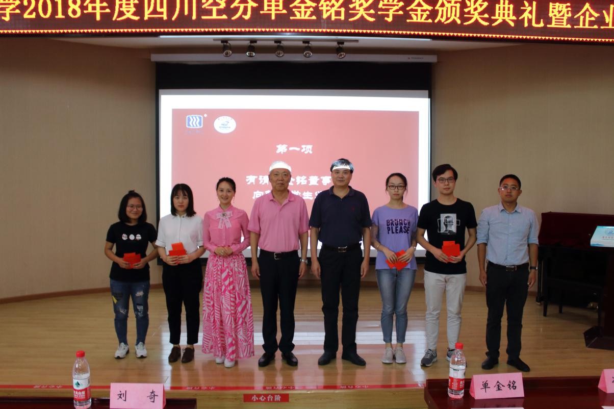 2018年9月13日下午,伟德BV1946官网2018年度四川空分单金铭奖学金颁奖典礼暨企业交流会在动力楼402隆重举行,到场的嘉宾有四川空分设备集团有限责任公司董事长单金铭先生、人力资源部副部长刘奇先生、董事长助理欧泊汐女士,公司党委副书记冯晓东老师,以及伟德BV1946官网15、16级的同学们。