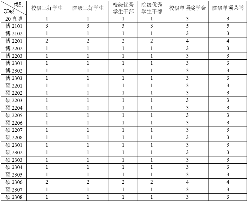 2.三种单项奖学金(自强奋进奖学金、文体公益奖学金、科技创新奖学金)班级名额为3的,各种单项奖学金各1个;班级名额大于3的(博2101班、博2201班、硕2306班),各班级根据各种单项奖学金申请人数自行分配,如1+1+2、1+2+2或1+1+3(调换顺序也可以)。