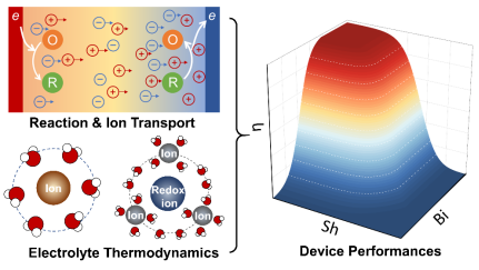 本论文阐明了影响i-TE器件效率的非平衡热力学机理,分析了传热、离子输运、反应势垒等因素对效率的影响规律,并从熵的角度总结并且分析了现有文献中提升离子热电器件功率与效率的可行方法。论文还进一步提出,不同于半导体热电材料,离子热电器件无法仅基于材料性质定义热电优值(ZT);通过对离子输运、电化学反应、传热的耦合分析,严格推导出了热离子电容与热化电池等离子热电器件的正确热电优值定义,并能够准确描述离子热电中传热、传质、电化学反应对器件效率的协同影响(图1)。论文针对i-TE热电器件仍然面临的挑战与未来的研究方向也进行了讨论与总结。