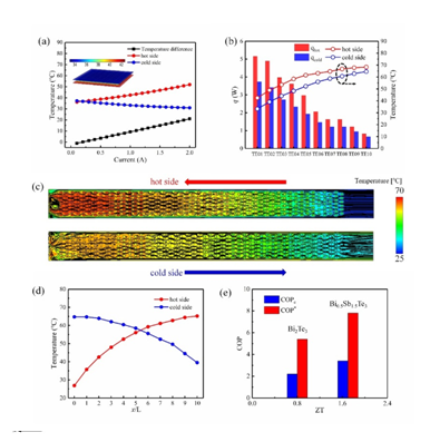 图2(a)器件两端的温差与电流的关系;(b)每个热电设备的加热功率、冷却功率和温度;(c)顶视图的增强通道模型部分的温度分布和流线;(d)增强通道沿流动方向x的温度变化;(e)不同热电材料的COPc和COP *。