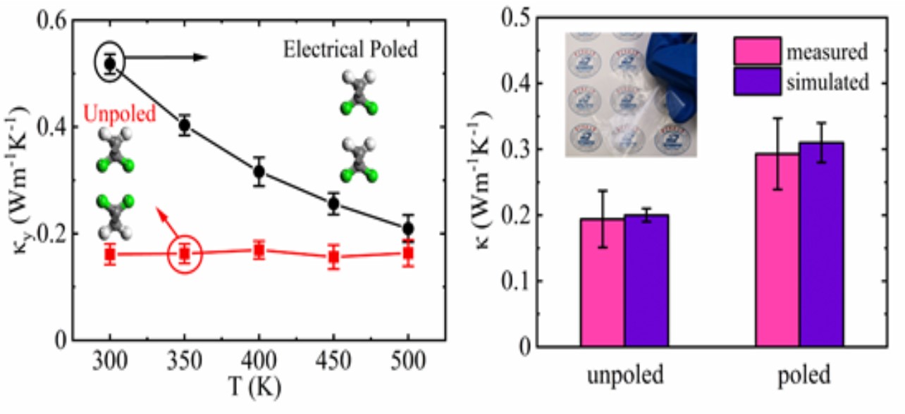 图 (左)极化前后聚偏氟乙烯热导率随温度的变化,和相应原子链排布(模拟);(右)室温下极化前后聚偏氟乙烯热导率对比(模拟和测量)