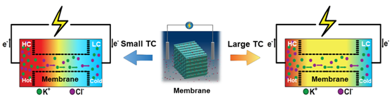 在最近发表于《国家科学评论》的研究工作中,伟德BV1946官网刘伟教授课题组做了这样的尝试,他们在系统两侧施加正温度差(高浓度侧温度>低浓度侧温度)或负温度差(低浓度侧温度>高浓度侧温度),探究了温度差对系统发电能力的影响。发现了离子在负温度差下的离子的热涌效应(离子扩散强度沿运输方向增强)可以促进通道的离子选择性,同时抑制低浓度侧的浓度极化,从而显著提高了膜电压,并改善输出功率,正温度差抑制系统功率输出。从上述效应出发,研究者还提出了一种电阻可调的离子电压源的构建方式:在低浓度强度下的厚膜体系中,系统膜电压由低浓度侧温度控制,系统内阻则由高浓度侧温度调节。