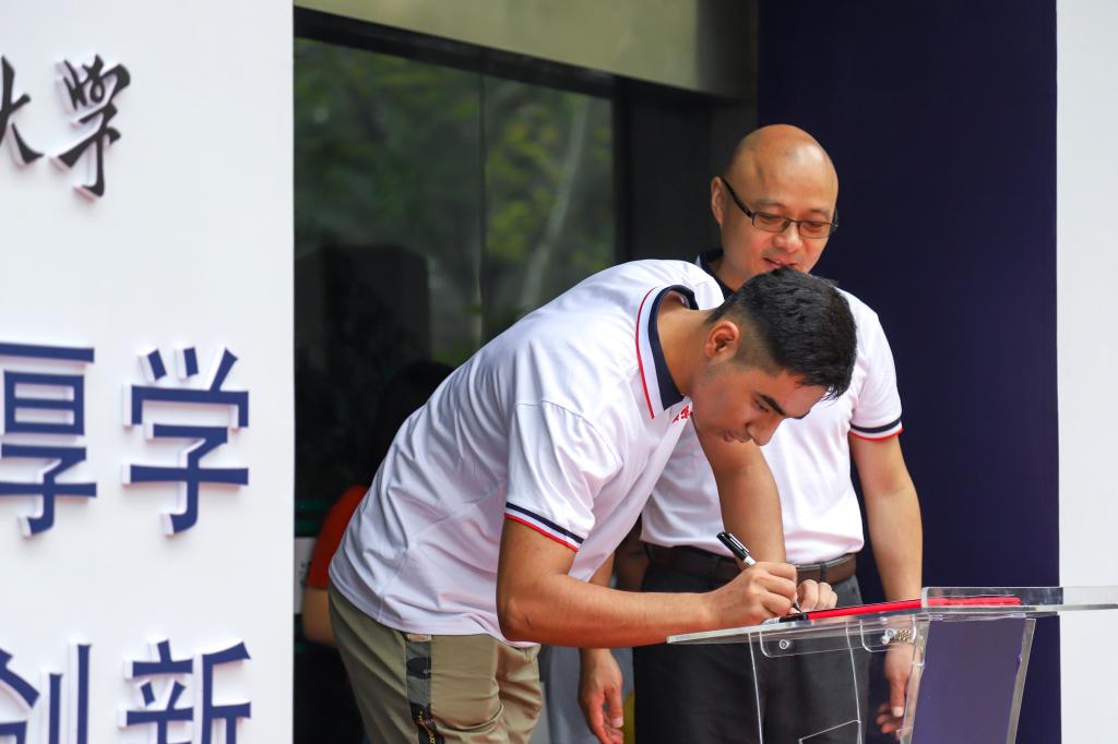 上午8时,入学纪念日仪式正式开始。伴随着庄重的音乐,295名本科2019级新生依次踏上红毯,向老师致敬。经理罗小兵教授对每位本科新生提出期望,一起签下“奋斗的约定”,并向新生颁发入学纪念礼。每一位新生还在“奋斗的约定”纪念墙上签下自己的名字,并同家长、老师、同学合影,记录这一特殊时刻。在仪式进行中,罗小兵还特意为三名当天生日的新生分别送上生日祝福,让同学们在这个特殊的日子里,感受到伟德BV1946官网集体的温暖。