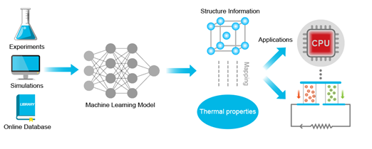 近几年,如何利用材料信息学推动热输运领域的前沿研究成为热点问题。人工智能已经被广泛应用于计算机、经济以及医疗等多个领域。其核心是机器学习(Machine Learning),而材料信息学(Materials Informatics)是结合了机器学习算法与材料科学工程的一个新兴领域。如下图所示,材料信息学是基于模拟计算或实验测量等方式得到的数据库,利用机器学习算法寻找特定性质的功能材料或预测目标材料的未知性质。它能够利用机器学习算法实现从材料“结构”到“热物性”的直接映射,从而可以根据预定标准对目标材料进行预测,避免大量重复的人力劳动。使用材料信息学研究热输运问题的关键是利用传统的模拟或实验方法得到足够的初始数据,选取有效的机器学习算法以及进行合理的机理分析。