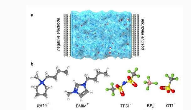 (a)分子动力学模拟系统图;(b)所用离子液体的阴阳离子结构图。