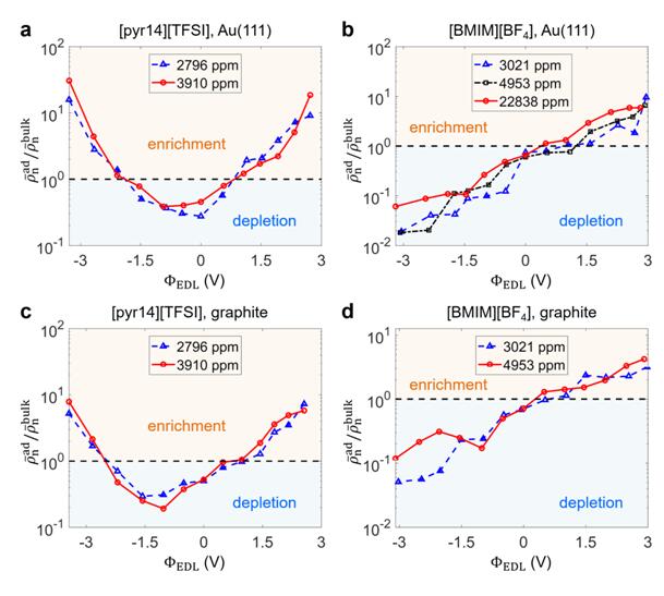 不同电压作用下水在电极表面上的吸附情况:疏水离子液体[pyr14][TFSI]与亲水离子液体[BMIM][BF4]中的水在金电极(a-b)与炭电极(c-d)上的电吸附。enrichment(depletion)表示,与远离电极处的体相电解液相比,电极表面吸附了更多(少)的水。