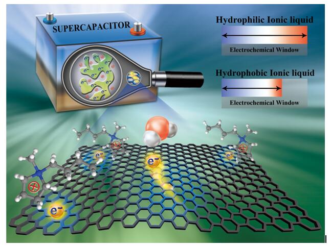 离子液体仅由阴阳离子组成,在室温下呈液态。除了热稳定性好、挥发性低、不可燃不爆炸等优点,相比常用的水或有机溶液电解质,离子液体具有更高的工作电压(4~6 V)。近些年来,用作储能装置(如电池和超级电容器)、电润湿技术、场效应晶体管、电化学传感器等所需的电解质,离子液体正受到越来越多研究者的关注和重视。然而,因其固有的吸水性,离子液体中的水总是难以被彻底除去。针对离子液体含水的影响,冯光教授的前期工作(ACS Nano 2014, 8, 11685)通过纳米尺度模拟计算预测出,在形成电极-离子液体双电层固液界面的过程中,离子液体中的水将会富集在电极表面上,而使器件/设备的工作电压变小,最终导致其工作性能降低——随后,该理论预测得到了许多实验与模拟工作的证实。因此,如何减小受潮离子液体中水的负面影响(在电极表面上的吸附),成为了离子液体电解质应用领域内亟需解决的核心问题之一。