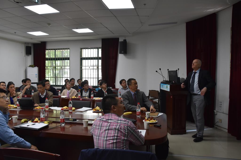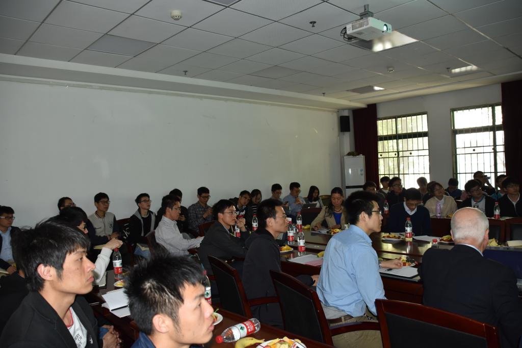 在本次访问期间,Kornyshev教授于4月16日下午参加公司冯光教授组织的主题为“Theory & Modeling of Electrical Double Layers at Solid-Liquid Interfaces”的铭师讲堂之小型专题讨论会,并做了题为“New Horizons in Ionics: Electrochemical Metamaterials”的学术报告。共同参加此次专题讨论会的还有清华大学的张剑波教授、武汉大学的陈胜利教授、伟德BV1946官网的王得丽教授、李小波副教授和吴鹏讲师、中南大学的黄俊副教授、华北电力大学的王天虎讲师和来自公司及武汉大学的本科生及研究生。讨论会前,公司副经理方海生教授会见了来访专家,并向与会嘉宾介绍了公司概况。