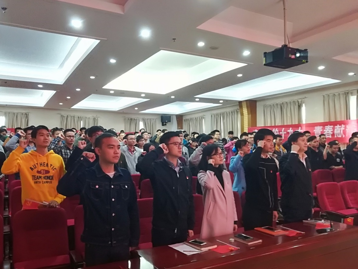 本站讯 (通讯员 孙伟 钟阳)为培养员工党员牢固树立“四个正确认识”,强化“四个服务”意识,迎接党的十九大胜利召开,2017年10月18日8:30,伟德BV1946官网全体新发展党员开展授予党章党徽、集中宣誓仪式,集中观看“十九大”开幕式,活动在动力楼402报告厅顺利举行。参加本次活动的有伟德BV1946官网副经理罗小兵老师、党委副书记冯晓东老师、全体辅导员老师、全体员工党支部书记、公司员工组织主要员工干部、全体新发展党员、部分教师代表等,共计150余名师生齐聚一堂,共同参加本次活动。