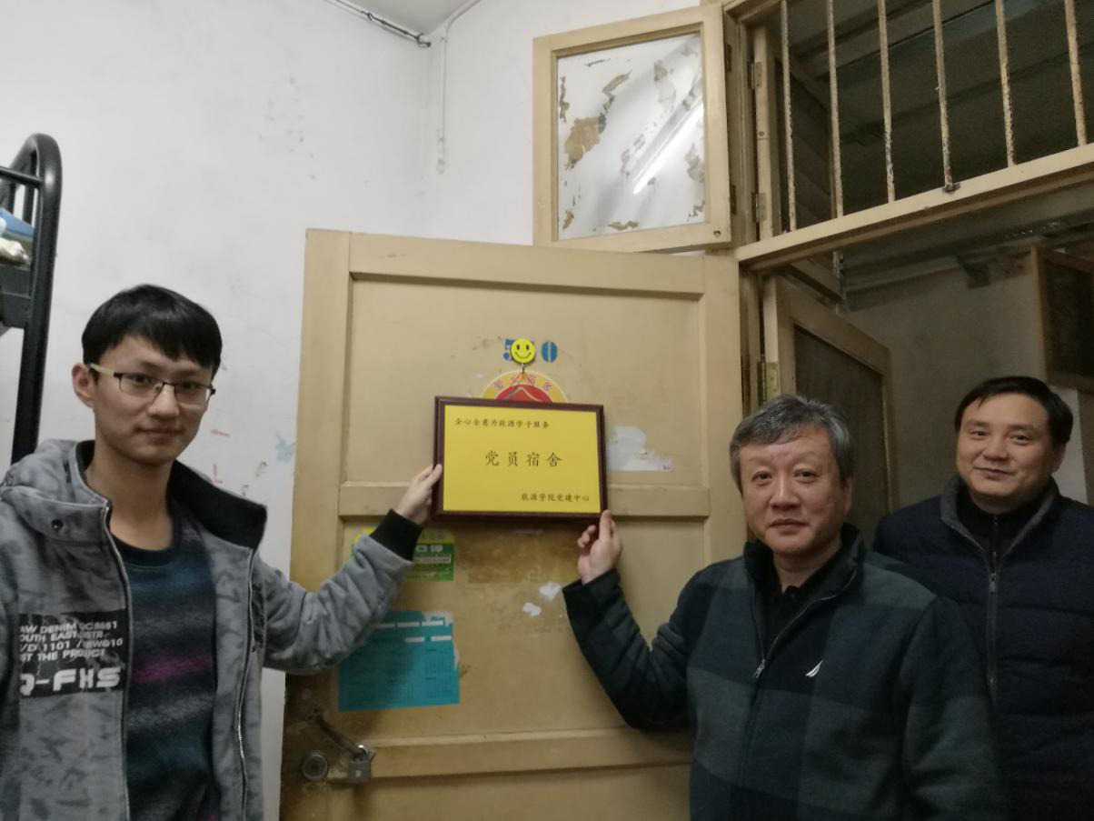 下午14:00,陈刚老师和冯晓东老师一同走进了伟德BV1946官网本科生宿舍紫菘6栋,深入员工宿舍为党员寝室挂牌。挂牌仪式由公司党建中心副主席李锡主持,李锡首先介绍了公司党员宿舍分布情况与此次挂牌情况。接下来由挂牌寝室代表袁佳乐同学介绍寝室基本情况:寝室有1名正式党员,2名预备党员,1名入党积极分子,4名成员学习成绩优秀,均参与过员工工作,热心公益,积极参与科研。在袁佳乐同学的带领下,与员工代表进行党员服务宣誓:牢记入党誓词,践行党的宗旨;从我做起,奉献示范;立足寝室:关系融洽、安全洁净、共同进步;做合格党员:讲政治、有信念,讲规矩、有纪律,讲道德、有品行,讲奉献、有作为。