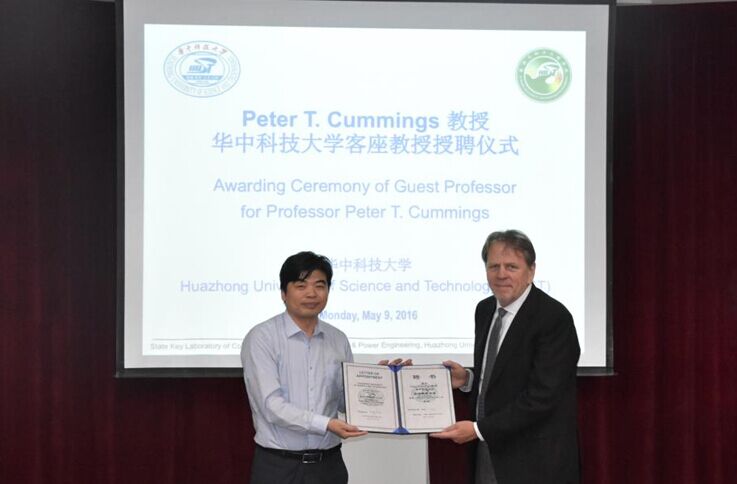 仪式开始,冯光教授对Peter T. Cummings教授进行了介绍。Cummings教授在科研方面成绩裴然,他的研究领域主要集中于流体等无定形系统的模拟,复杂系统的分子模拟,理论与计算纳米科学,基于计算机辅助的过程设计与优化以及生物系统的模拟。已发表5部专著;22篇综述和科技报告;400多篇期刊论文,包括Cell、JACS、PRL、Nano Letters等期刊,涵盖生物、化学、物理、材料和能源等领域;总引用超过13500次,H-index为59。被200多个高校等科研单位邀请做学术讲座,180多个学术会议邀请报告。获Yeram S. Touloukian奖、John M. Prausnitz奖等重要奖励。Cummings教授曾任美国橡树岭国家实验室纳米材料科学中心首席科学家,现任范德堡大学工程公司研究副经理、化学与生物分子系John R. Hall教授、隶属美国能源部的FIRST能源前沿研究中心副主任。Cummings教授是美国化工学会(AIChE)、美国科学促进会(AAAS)和美国物理学会(APS)会士,同时任AIChE Journal副主编,以及Molecular Simulation、Journal of Theoretical and Computational Nanoscience、Journal of Chemical Thermodynamics、Fluid Phase Equilibria、Journal of Computational Science等期刊的编辑。