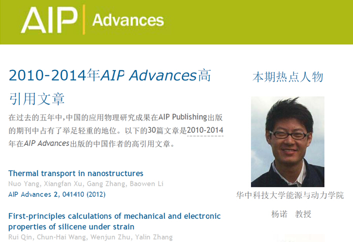 近年来,中国的应用物理研究逐渐发展,并开始在AIP的出版中占据举足轻重的地位。公司杨诺教授及其合作者的文章“Thermal transport in nanostructures”入选AIP最新评选出的30篇从2010年到2014年间AIP Advances出版的中国作者的高引用文章,而杨诺教授本人也被评为该期热点人物。在热烈祝贺杨诺教授的同时,也期待他指导的纳米传热实验室再接再厉,在应用物理和能源利用领域做出更多贡献。