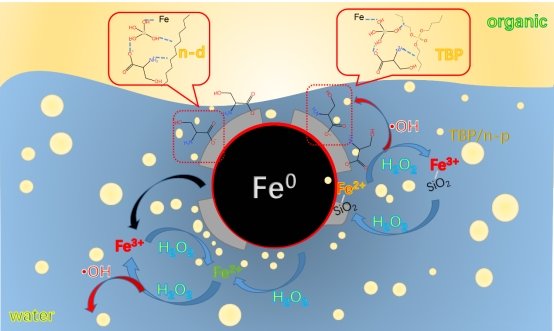 针对这一难题,徐乐瑾副教授团队通过丝氨酸接枝与Stöber法相结合,在纳米零价铁(nZVI)表面构建二氧化硅包覆层并接枝丝氨酸分子,形成独特的核壳结构催化剂Ser-SiO2@nZVI。该催化剂凭借三重协同效应实现性能飞跃。实验数据显示,Ser-SiO2@nZVI对混合有机溶剂的氧化效率超65%,有机相去除率高达98%。更值得关注的是,核素模拟实验验证了其卓越安全性:使用Nd³⁺、Ce⁴⁺、Sr、U模拟放射性核素时,超90%核素留存于反应容器中,且核素存在不影响降解效率,规避了核素扩散风险。此外,该催化剂在反应中Fe溶出量更少,Fe²⁺浓度更高,既能减少二次污染,又能保障反应持续高效进行。