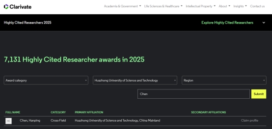 2025年11月12日,科睿唯安(Clarivate Analytics)发布了2025年度“全球高被引科学家”名单,旨在表彰在各自研究领域产生重大广泛影响的全球顶尖科研人员。来自全球60个国家和地区1300多家机构的6868名科学家(共计7131人次)入选。中国内地以1406入选人次位居第二,占总人次的20%,公司有20名(21人次)学者上榜,公司陈汉平教授再次入选交叉领域(Cross-Field)“全球高被引科学家”名单。