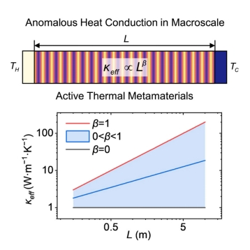 在宏观尺度下,热传导过程通常遵循傅里叶定律,热导率与体系尺寸不存在直接关联。然而,在微观尺度下,当体系尺寸接近声子平均自由程时,受边界散射影响,傅里叶定律可能失效,出现热导率随尺寸增大而发散的反常现象,即κeff∝Lβ。其中指数β可用于表征不同导热状态:扩散态(β= 0)、弹道-扩散态(0 <β< 1)和弹道态(β= 1)。通常此类现象仅在微观尺度下被观察到,但本研究创新性地利用主动热超材料(Active Thermal Metamaterials,ATMs)这一平台,在宏观尺度上重现了上述反常热传导行为。通过在基体材料中嵌入可编程的冷热源,该平台能够自由调控内部温度场,以模拟微观尺度下的反常热传导现象,从而在宏观尺度上成功观测到随体系尺寸变化的等效热导率,即κeff∝Lβ(0<β<1)。这是在宏观尺度下首次报道此类反常热传导现象,模拟和实验均验证了这种反直觉现象,并进行了详细的物理讨论。该研究揭示了一种全新的热物性调控规律,极大地拓展了材料热物性调控手段,为动态调控热功能材料以及具备任意形状、尺寸与功能的热功能器件设计提供了解决方案,也为先进热管理开辟了新途径。