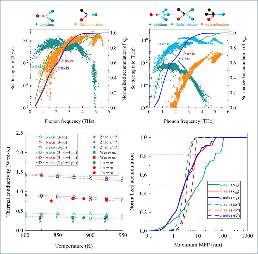 高温相硒化亚锡(SnSe)具备超低本征热导率与高功率因子,近期大量文章报道了通过实验手段获得高热电优值的硒化亚锡,在热电与清洁能源应用上具有极大的潜力。刘德欢教授的工作基于第一性原理计算及求解线性化波尔兹曼方程,逐模地研究高温相硒化亚锡声子的输运性质,为理解硒硒化亚的高热电优值与后续的纳米结构工程优化提供了理论基础。重要结果如下:(1)考虑有限温度引起的晶格非谐性,克服基态密度泛函理论导致的热不稳定性,获得准确的高温相硒化亚锡声子谱;(2)发现四声子耦合会使得面内及面外热导率额外下降38%及19%,其中以再分布过程所贡献的热阻最为显著,得到的晶格热导率与实验值更加稳合;(3)发现材料的特征尺寸约在10纳米时,可以最大限度降低晶格热导率而不影响功率因子,为使用纳米结构工程优化硒化亚锡的热电优值提供理论上的依据。
